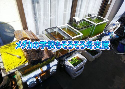水槽が小さいので・・・ 我が家のメダカの学校は教室(水槽)小さいので、部屋としての比熱が小さく、寒暖の影響をとても受けやすいのです。これまでも、犠牲者は出ませんしたが、水槽が凍ったこともあります。そこで、今年は下の写真のような教室を丸ごと冬囲…