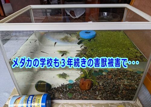 応接スペースに保護 highdy が別宅滞在中、我が家のは3度目の(ハクビシンと思われる)獣害被害に遭い、壊滅的な打撃を受けました。たかがメダカごときを・・・と笑われそうですが、度重なる獣害から守るために、30~40匹生き残った生徒達は種類構わず一つの教…