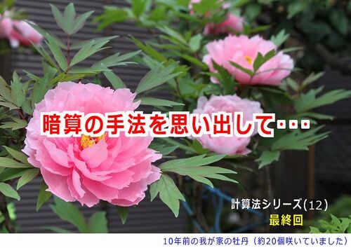 いよいよ終わりに 今回でいよいよ計算法シリーズもこれで終わりにします。ダラダラと思いついたまま書いていると駄文が増えるばかりですので・・・。が、最後にシメとしてひと言。暗算のテクニック 必ずどれか一つだけでも覚えて、家族や友達を驚かせてください…