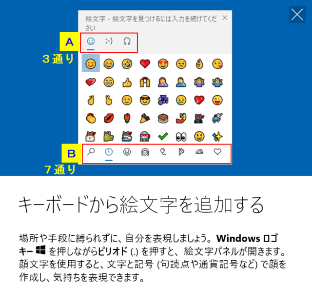ご存知のように Windows10では、[Windows]キー(windowsロゴキーともいう)を押しながら、[.](=[る],ピリオド)を押すと、絵文字のパレット(下図)が出てきます。