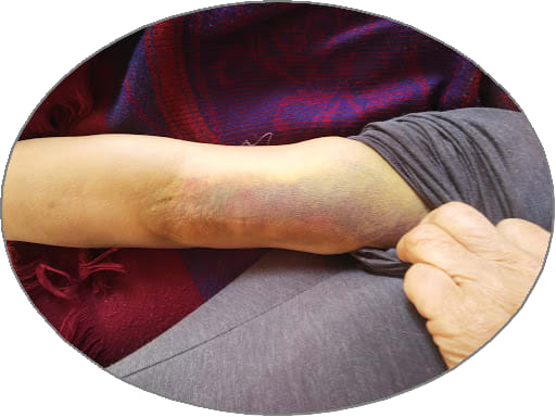 例の上腕部内側の内出血についても写真では大差ないようですが、数日前に比べると肉眼では少しずつ改善されているようです。