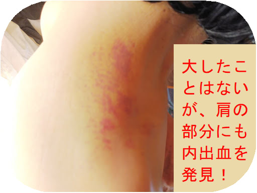 紫陽花は、事件後入浴はおろかシャワーも浴びることができない状態が約1週間続いたので、昨日は暖かい蒸しタオルで体を拭いてやりました。その際に、新たな内出血が方の部分にあることを発見しました。