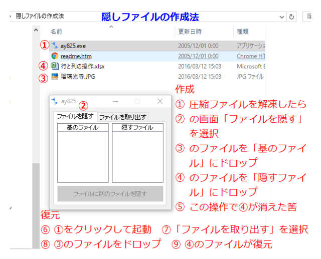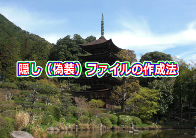 「画像」ファイルに「音楽」ファイルを隠したり、「 Excel」 ファイルに秘密の「写真」を隠したり使い方はいろいろで、画像ファイル、音楽ファイルに限らず、どんな種類のファイルでも隠すことができます。上述のように擬装したファイルをさらに擬装することもできます。