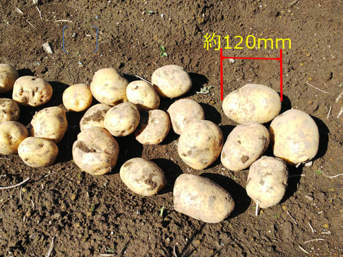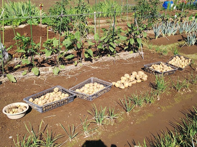 今年はかなり出来がいい感じで、計量はしていませんが、1kgの種イモからざっと50kgの収穫です。品種は果肉が黄色い「キタアカリ」で北海道の「男爵」、九州の「メークイン」、本州の「農林?号」などに比べて、種イモは若干お高い(700円余り/kg)ですが、食感や味は格別です。