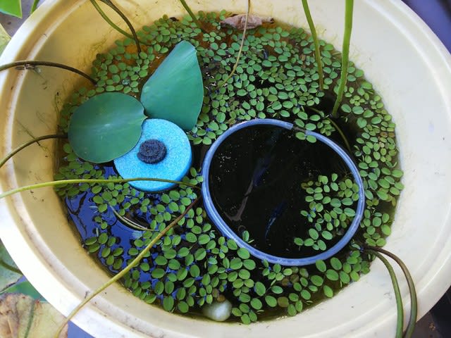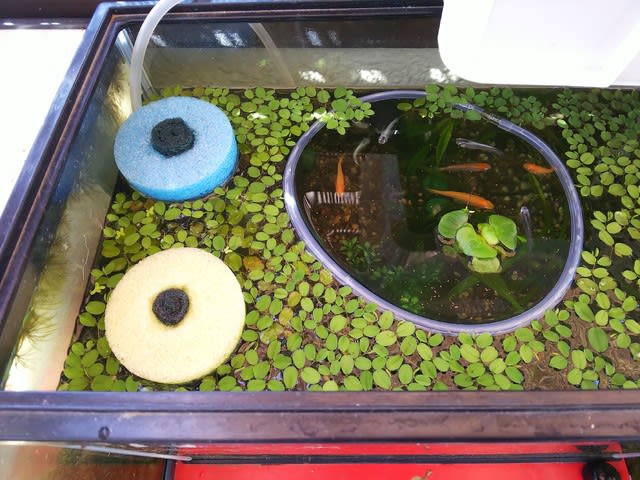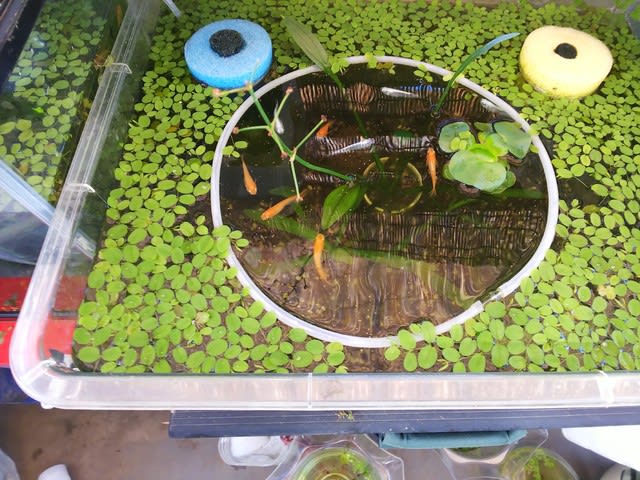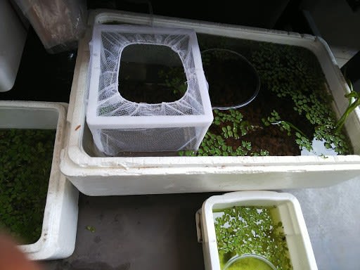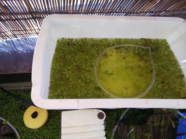 ところが、ご覧のように、グリーン水が濃くなり濁ってきました。放っておいても 1年やその位は平気ですが見て美しくなく、楽しくありません。水を交換してやろうと思って様子を見ると、数がメチャメチャ少ないのです。毎日せっせと孵化した赤ちゃんを入園させていたのに・・・。