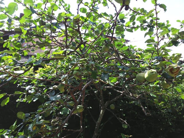 そこで少し庭を歩いてみると、ピンポン玉をひと回りかふた回り大きくしたサイズのボケの実がざっと100数10個くらいかな。何かに利用しようと思いつつ、毎年そのままです。