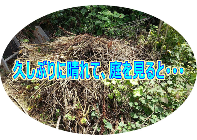 山口に来て間もなく少しだけ庭仕事をし、軽トラック一杯分くらいあった、剪定した木と雑草の山は枯れて概ね半分になっています。(タイトル画)