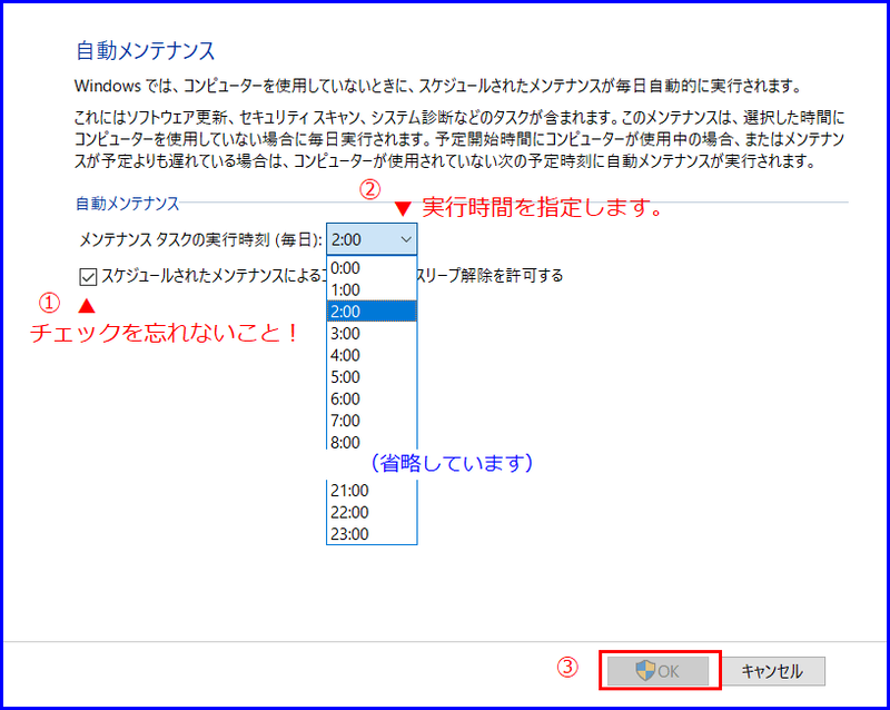 自動メンテナンスは、PC起動中(電源が入っている時)にのみ実行されるため、メンテナンス時間が業務時間内に設定されていると、ユーザー作業中に開始されることもあり、急激にPCに負荷をかけてしまい、操作がスムースできないことがあります。作業中にそのような症状になった場合、自動メンテナンスのスケジュールを疑う必要があります。