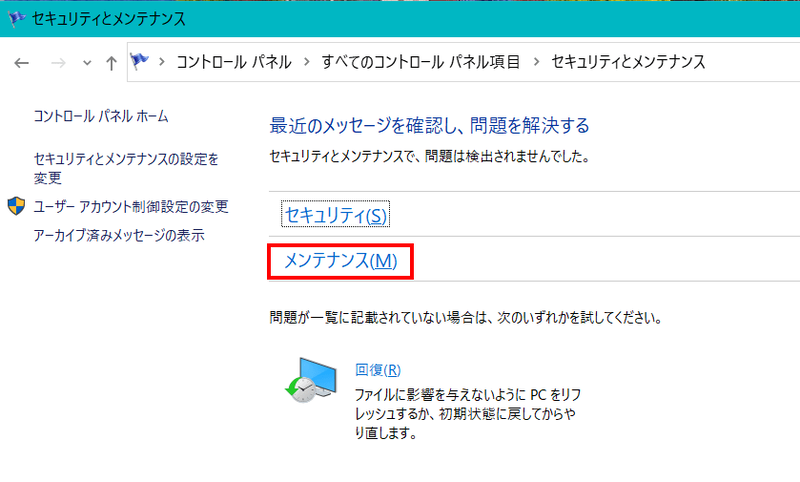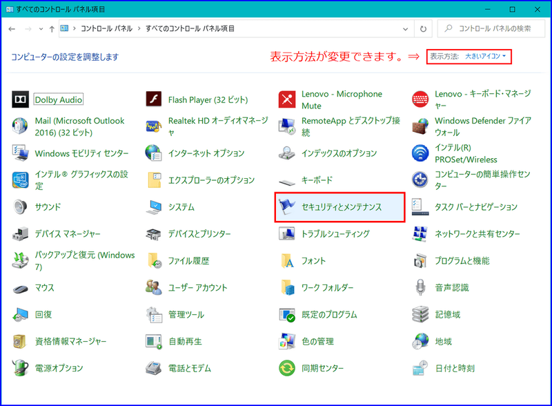 コントロールパネル (画面右上の表示方法は「大きいアイコン」の場合) → シスセキュリティとメンテナンス