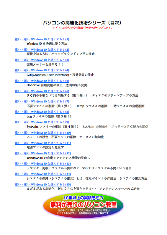 お勉強された皆様にはお疲れさまでした! Windows10 はどんどん重くなるのに、低能力PCでも買ったときと変わらない速さ、特に最近買われた方は買ったときより速くなったことを実感されたと思います。