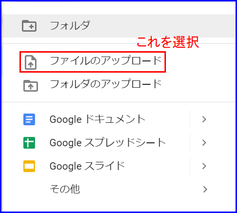 2.Googleドライブに移動 → 「新規」→ 「ファイルのアップロード」を選択 → 開いたダイヤログで画像ファイルを選択すると、瞬時にアップロードが完了します。