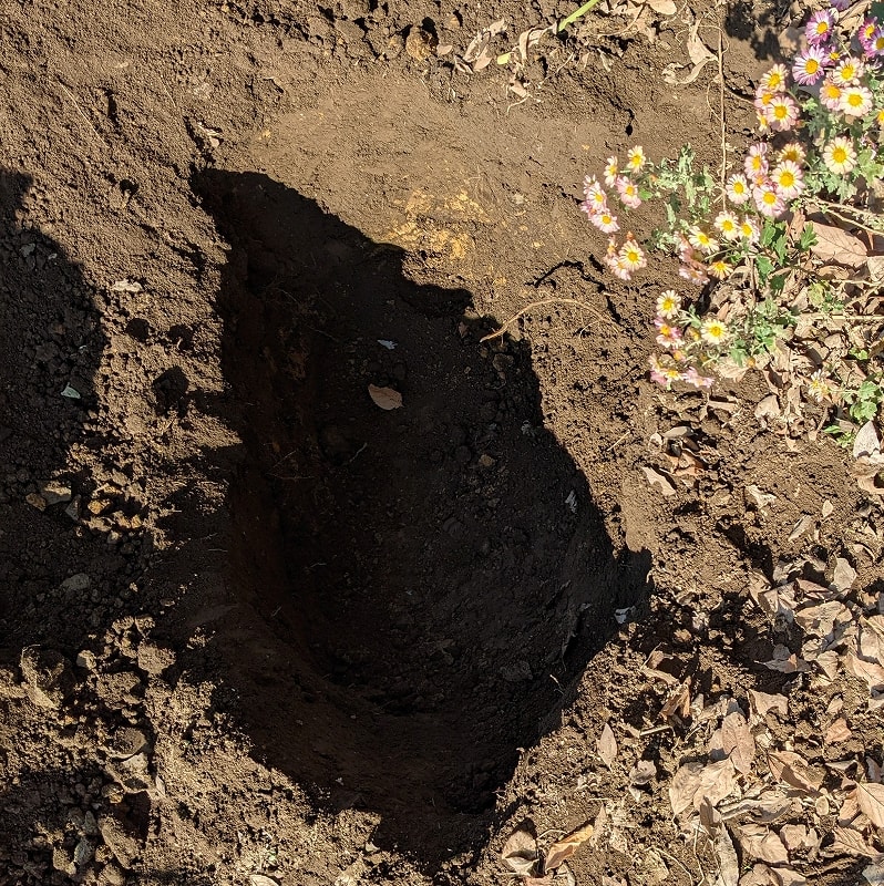 いつもそうですが、今回も白いマスク、真っ白な上下つなぎの無塵衣に真っ黒なJA帽子と長靴・ゴム手袋すべて黒色統一で現れ、(鳥インフルエンザかコロナ重症患者への対応のような出で立ち?!)紫陽花に指示された場所に約60cm×タタミ半畳位の穴を黙々と掘りました。