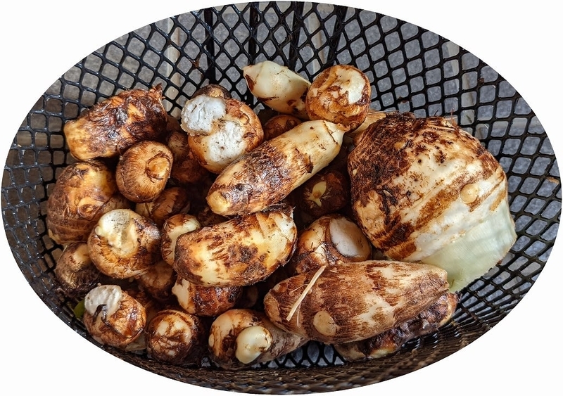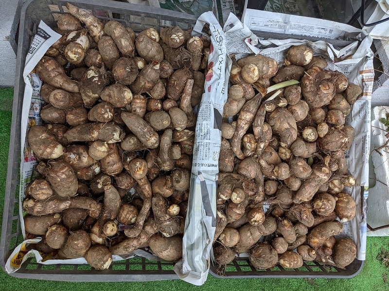 毎年食べきれずに残って困るので、今年は5株だけにし八つ頭も無しです。取り敢えず3株のみ掘り、2株は葉っぱを切り取り土を被せてあり後日掘る予定のようです。3株だけでもご覧の通りで、花かご(カゴトレー)にたっぷり2杯あります。親株は一部を捨て(食べられますが・・・)、いいものを下記の穴に埋めます。