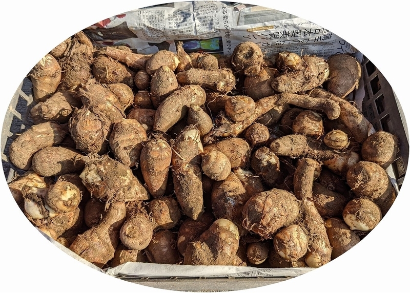 今年の里芋の収穫はこのブログの記録(我が家の家庭菜園は農繁期!)によれば、昨年より10日余り遅れています。いつも霜が降りるギリギリまで待って収穫をします。少しでも長く生きたまま土中で保存して食べるためです。