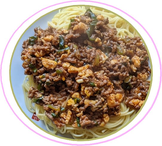 急いで庭のネギを収穫、刻んでオリーブ油で挽肉と炒め、白出汁を加えた炒り卵を混ぜ、味醂・トマトケチャップ・ウスターソースで味を調整、何とかインチキ・ミートソースが完成しました。