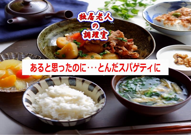 遅くなったので簡単にスパゲティで済まそうと、一束 100g の乾麺を茹で始めました。その間にレトルトのミートソースを準備しようと冷蔵庫を探したところ、えっ?ない! あったのは「角煮のたれ」で、使ってしまって補充をすっかり忘れていました。