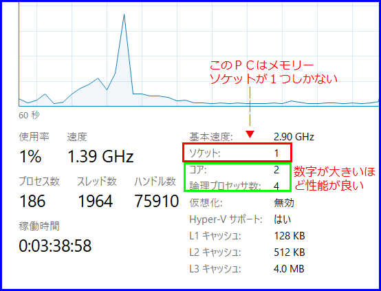 但し、タスクマネージャーでメモリースロットが1個のものと2個のものがあり、メモリーの選択法が異なります。