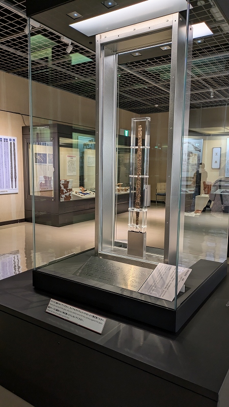 数々の国宝が展示してありますが、有名な国宝の「金錯銘鉄剣」は、現在展示ケース改修のためとかで、当面の間はレプリカが展示(下の写真)してあります。